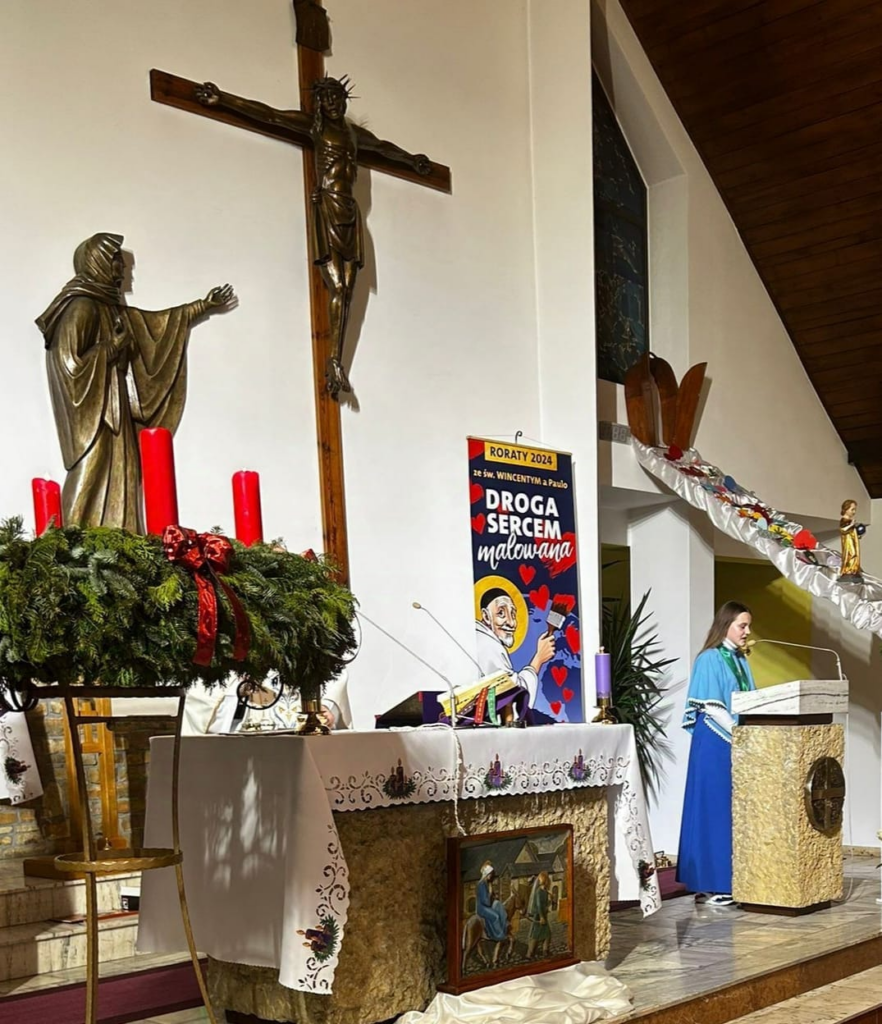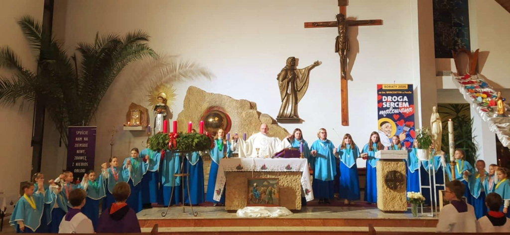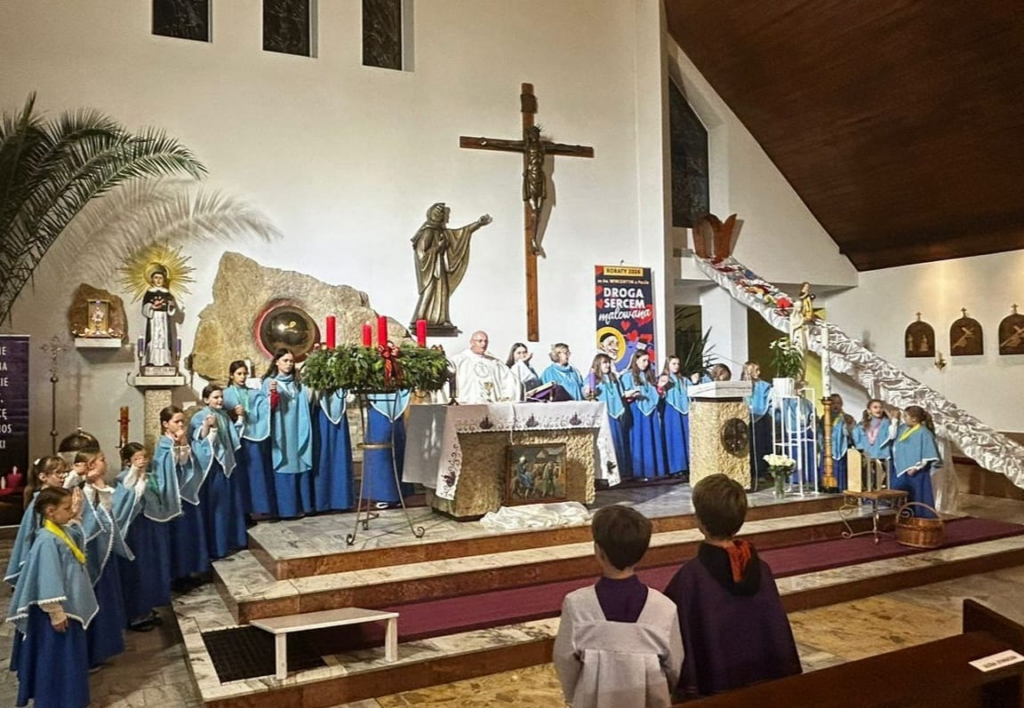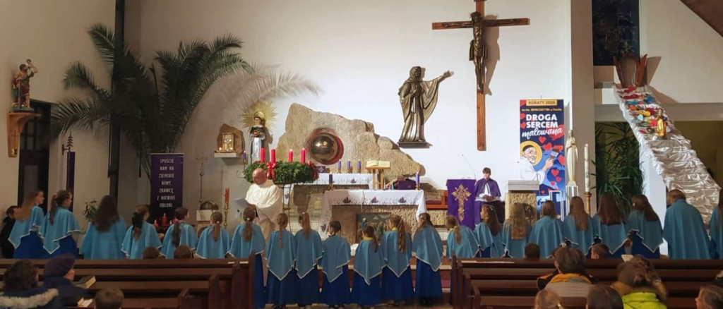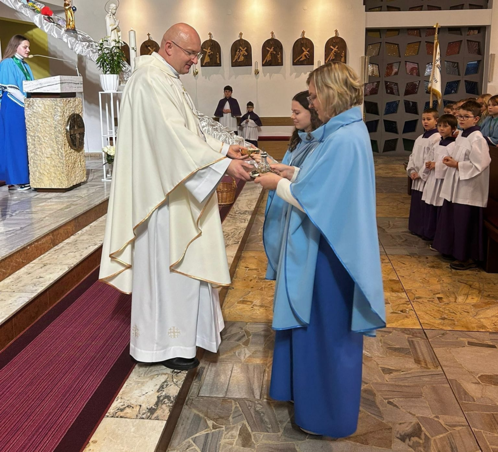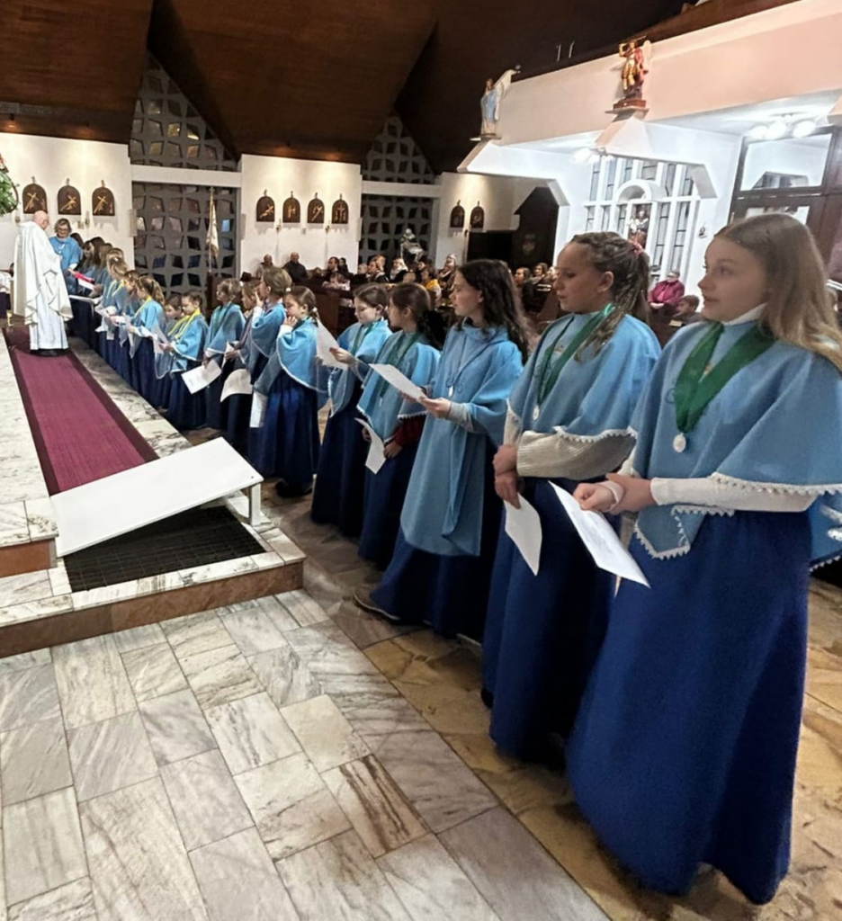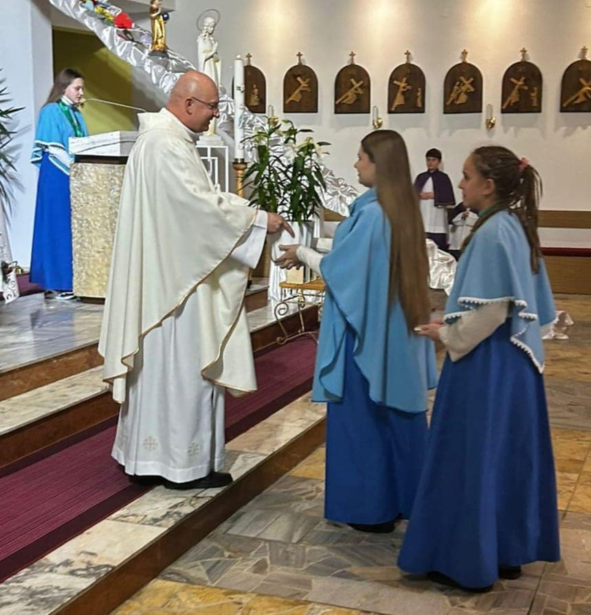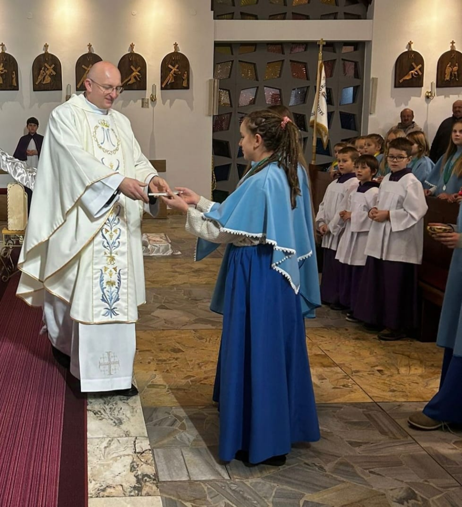 25 naszych dziewcząt należących do grona Dzieci Maryi odnowiło swoje przyrzeczenia. Niektóre Marianki otrzymały nowe medaliki. Białe róże były wyrazem naszej wdzięczności za posługiwanie naszych dziewczyn przy ołtarzu.