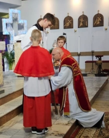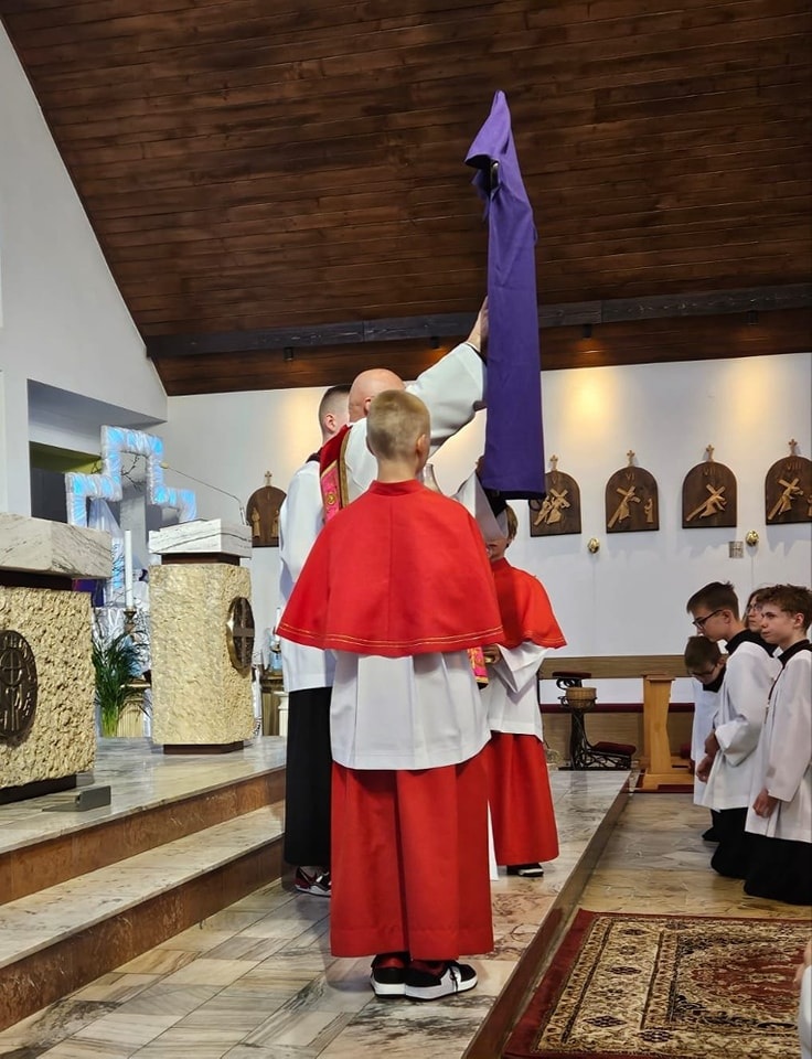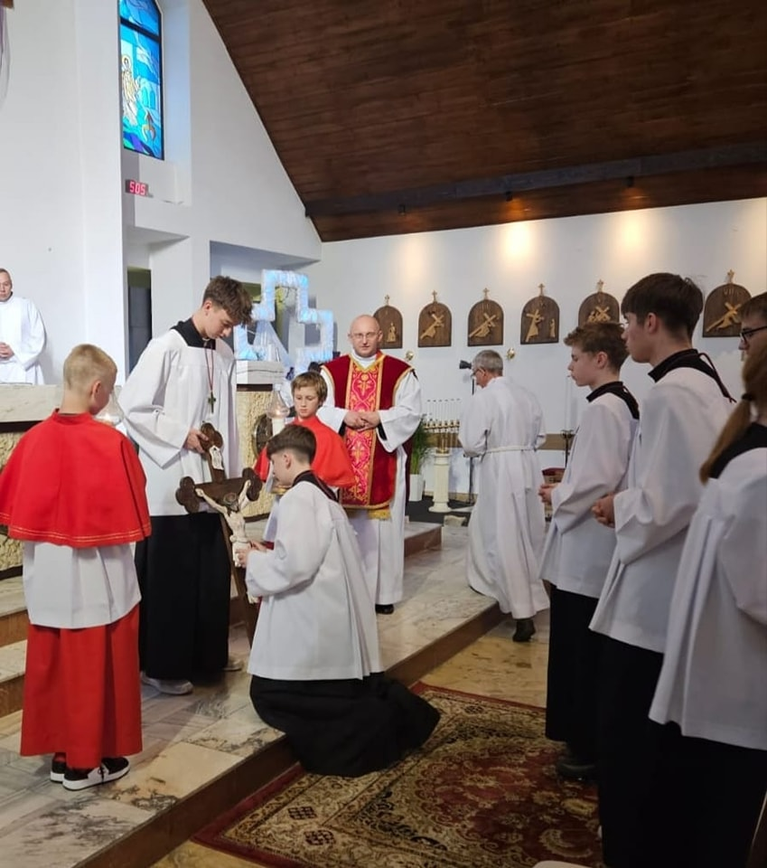 W czasie wieczornej liturgii odczytany został tekst Męki Pańskiej, a także uroczyście odsłonięty Krzyż. Teraz Jezus obecny w Najświętszym Sakramencie złożony do Bożego Grobu.